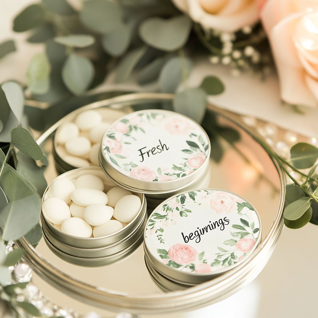 End the night on a refreshing note with customized mints. Opt for tins or rolls featuring your wedding date and a short message of thanks.