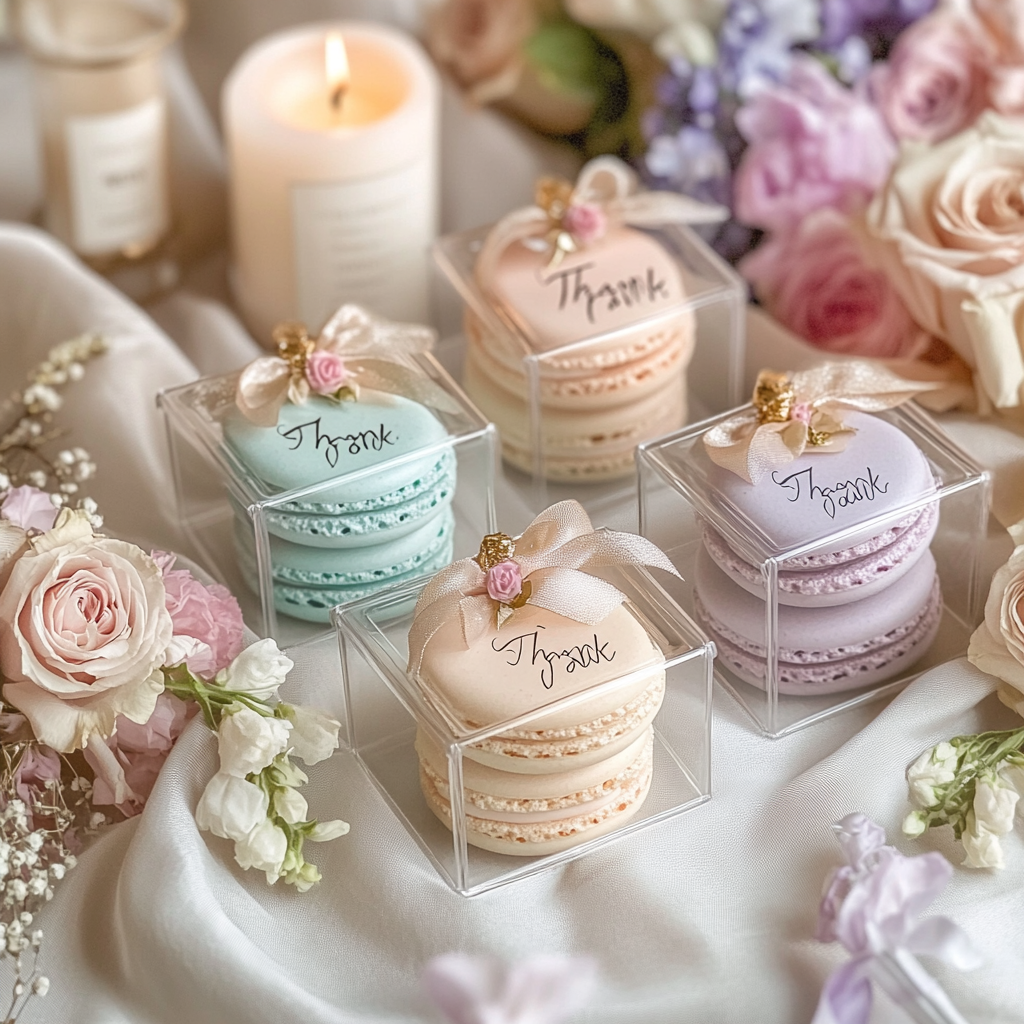 Keep It Chic: Choose two or three coordinating macaroon flavors and pack them in clear boxes tied with a ribbon.